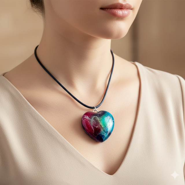 Sublimez votre décolleté avec ce pendentif cœur aux nuances intenses de pourpre et de turquoise. Fabriqué avec une résine de haute qualité pour une brillance durable et une transparence cristalline.