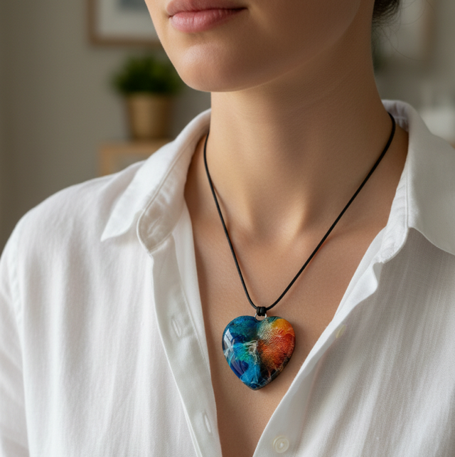 Laissez-vous envoûter par le Pendentif Cœur Fusion, une création artisanale qui capture la puissance des éléments. Entre la profondeur des abysses et l'éclat d'un coucher de soleil, ce bijou est une fenêtre ouverte sur l'imaginaire.